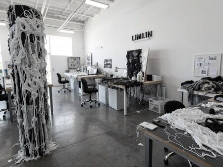 Generate a high-detail, photorealistic image of the «LIMLIN» creative workspace. This space embodies the brand’s essence: a modern, tactile, and artistic hub for textile transformation through hot glue textures. The overall aesthetic should be monochromatic (black and white) with a sophisticated, clean, and studio-like feel.