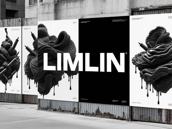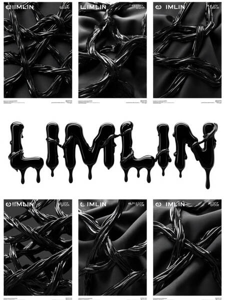 Generate a series of visually striking, modern posters for the brand «LIMLIN». The posters should heavily feature the LIMLIN brand identity, abundant applications of hot glue in various forms, and a significant presence of the brand name. The aesthetic should be bold, artistic, and tactile, reflecting LIMLIN’s specialty in creating textured fabric art with hot glue. black and white