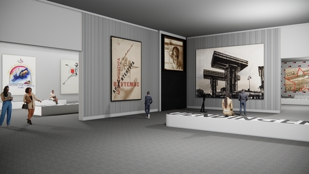 «Пространство, сгенерированное ИИ» - Recraft (2 изображения) Промт: The interior of the avant-garde art exhibition dedicated to El Lissitzky is a minimalist space inspired by his work. The floor is dark, slightly reflective, and the ceiling is light with track lightning system and walls are light. El Lissitzky’s paintings in dark frames hang along the sides of the corridor.