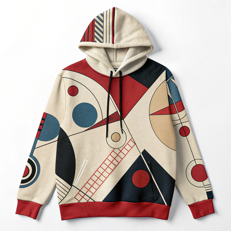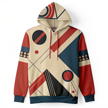 «Мерч» - Recraft Промт 1 (худи, 2 изображения): The hoodie should feature a constructivist graphic design with bold geometric shapes: circles, triangles, rectangles, and diagonal lines — arranged in an abstract composition. Use a limited color palette: red, beige, blue, and black. Display the hoodie alone on a clean white background, centered in the frame, with professional lighting and minimal shadows.