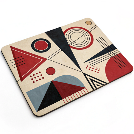 Промт 3 (коврик для мыши): Create a realistic image of a mousepad inspired by El Lissitzky’s constructivist art style. The mousepad design should feature bold geometric shapes: circles, triangles, rectangles, and diagonal lines — in an abstract, architectural composition. Use a limited color palette: red, blue, beige, and black. Display the mousepad alone on a clean white background, centered in the frame, with soft, even lighting.