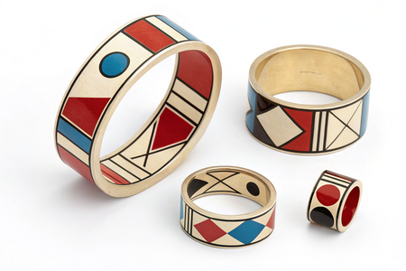 Промт 5 (кольца и браслеты): Create a realistic image of bracelets and rings inspired by El Lissitzky’s constructivist art style. The jewelry should feature bold geometric shapes: circles, triangles, rectangles, and diagonal lines — arranged in an abstract, modern composition. Use a limited color palette: red, blue, beige, and black. Display the bracelets and rings alone on a clean white background, centered in the frame, with soft, even lighting.
