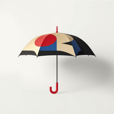 Промт 2 (зонт): Create a realistic image of an umbrella inspired by El Lissitzky’s constructivist art style. The umbrella design should feature bold geometric shapes: circles, triangles, rectangles, and diagonal lines — in an abstract, avant-garde composition. Use a limited color palette: red, blue, beige, and black. Display the umbrella alone on a clean white background, centered in the frame with soft, even lighting.