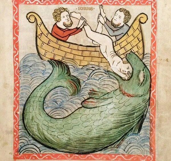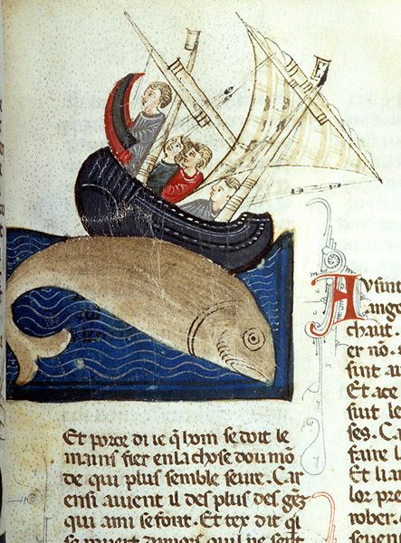 1-Иона в чреве кита. Иллюстрация к Библии. Кельн, около 1360. 2- Манускрипт. XIII в.