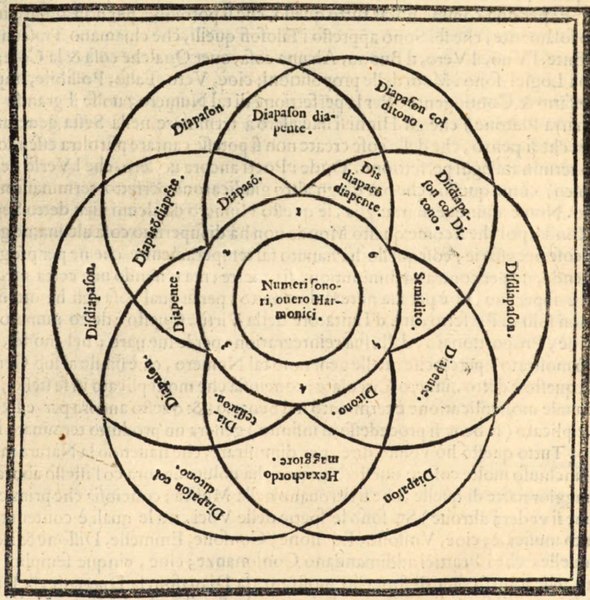 Примеры диаграмм от Джузеффо Царлино, демонстрирующих музыкальные пропорции с помощью пересечения шести круговых множеств.