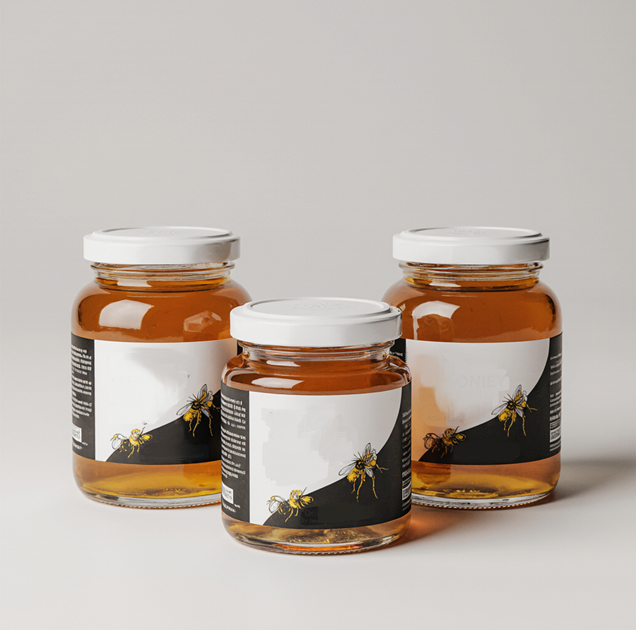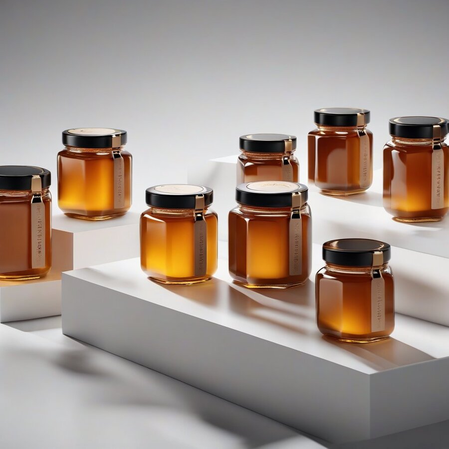 Промт: exquisite photography of elegant jars of wasp honey, presented in a commercial product presentation style, with a minimalistic and hyperrealistic approach, captured in 8k resolution, highly detailedpredominantly featuring white, black, and vibrant orange colors, with precise lighting to accentuate the texture and clarity of the honey and jars, showcasing the luxury and sophistication of the product, with a clean and simple background to emphasize the main subject, A minimalistic design approachreflect the symbolism of poison, which becomes sweet drop by drop to convey the spiciness of the product.