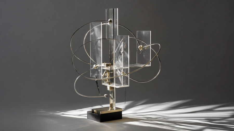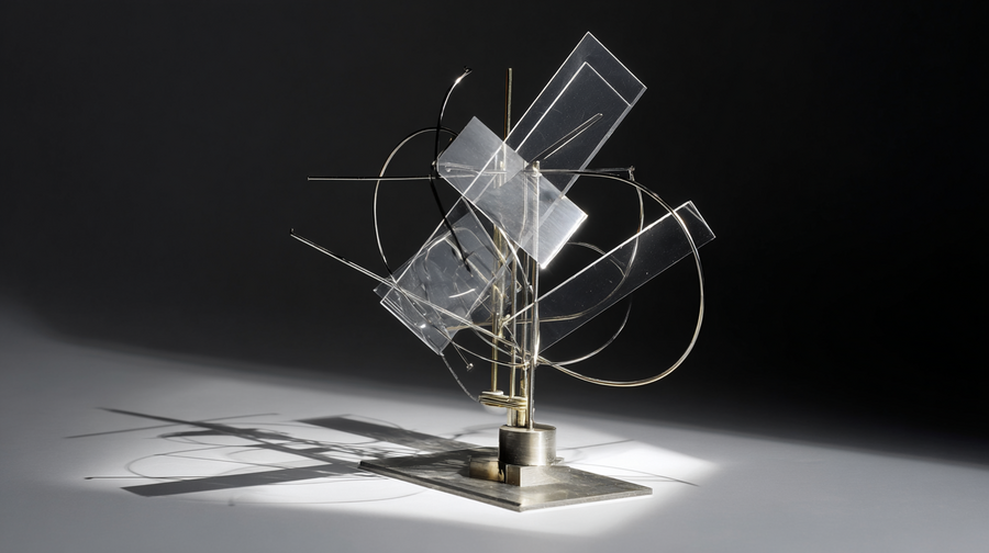 midjourney: A small desktop kinetic sculpture, inspired by Laszlo Moholy-Nagy’s Light-Space Modulator. Complex interlocking of geometric shapes made of transparent acrylic and polished brass, a small motorized base, casting intricate moving shadows on the wall. Bauhaus style, constructivism, dematerialization art. Minimalist, precise engineering, dramatic studio lighting, dark background. black and white