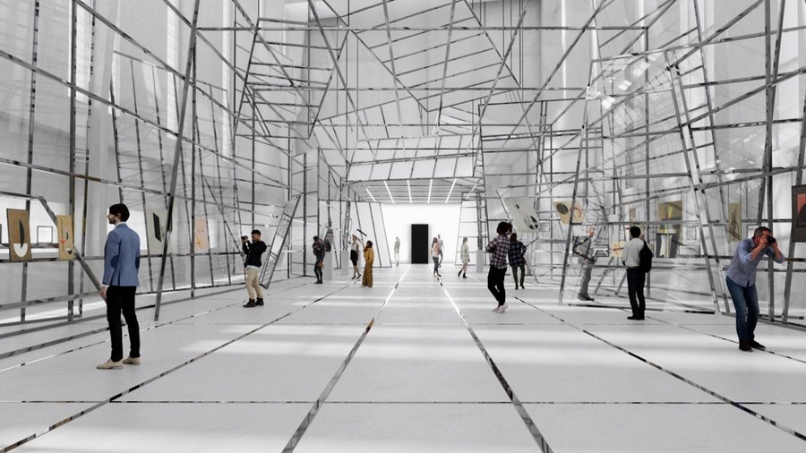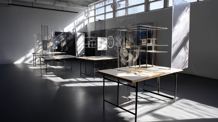 krea: Exhibition space inspired by László Moholy-Nagy, titled «Nothing Else Matters.» A minimalist, experimental white gallery environment exploring the concept of dematerialization. The space combines white light, polished metal structures, translucent glass planes, suspended geometric forms, and kinetic light reflections. Architecture emphasizes transparency, weightlessness, and movement of light rather than solid walls — light beams, metal grids, and floating frames create an almost immaterial atmosphere. The mood is rational yet poetic, merging Bauhaus functionalism with futuristic abstraction. Include clean geometry, reflections, optical effects, and a sense of infinite spatial depth. The composition should look like an avant-garde installation from the 1920s reinterpreted through a 21st-century digital aesthetic. — White and metallic color palette, subtle lighting gradients, focus on light as material. — No people, pure spatial experience. — Rendered in a realistic architectural style, wide-angle perspective, museum interior.