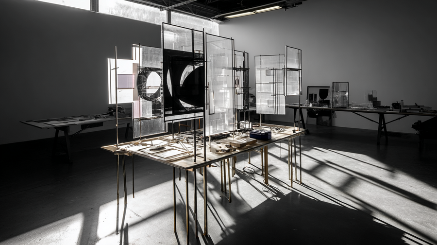 midjourney: A community art workshop studio inspired by Laszlo Moholy-Nagy, Bauhaus style. A large, bright, industrial space with geometric furniture. Walls are used as projection screens for light experiments and photograms. Tables with constructivist art tools: transparent materials, metal wires, basic forms for composition. Dramatic play of light and shadows, monochromatic with accents of primary colors.