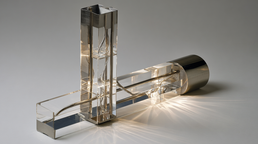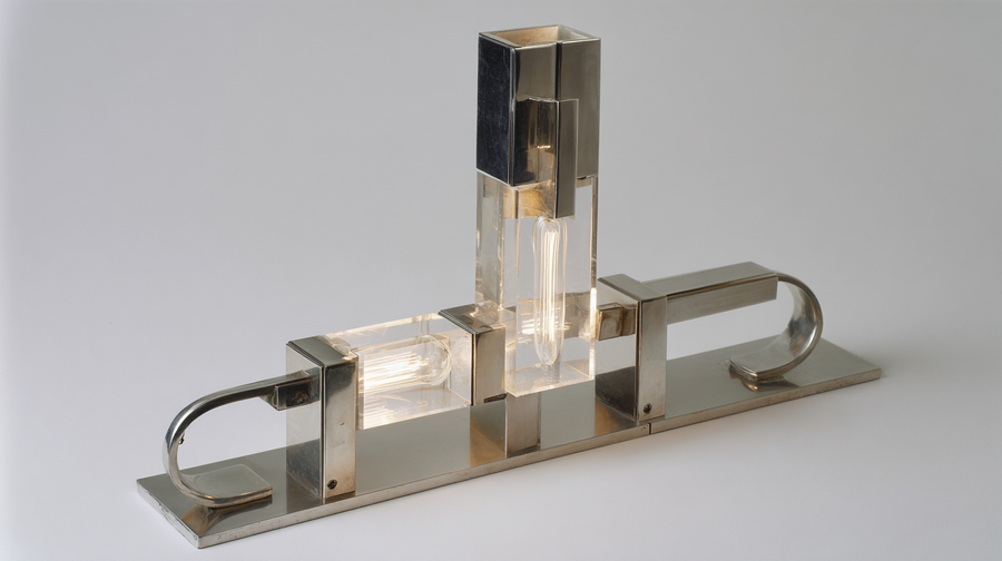 midjourney: A functional art flashlight, designed by Laszlo Moholy-Nagy, Bauhaus constructivism. The body is a geometric assembly of translucent acrylic panels and polished chromium-plated brass. The light source is modular, creating refracted patterns and casting intricate geometric shadows on the surrounding surfaces. Dematerialization of light, industrial aesthetic, hyper-detailed product design.