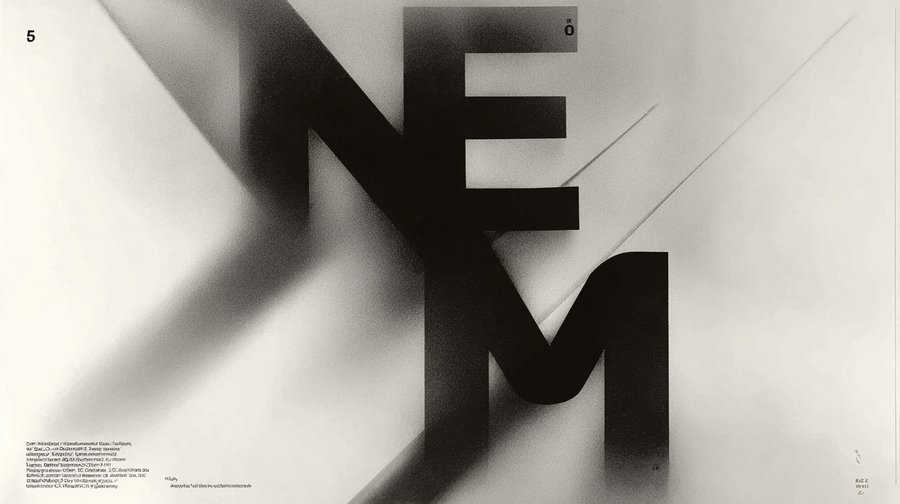 midjourney: A Bauhaus constructivist exhibition poster for «NEM» (Nothing Else Matters). The letters NEM are the main focus, crafted from dramatic, intersecting beams of light and solid geometric shadows, cast against a minimalist background. Style of Laszlo Moholy-Nagy, using a stark monochromatic palette with one primary color accent. Dynamic typography, photomontage, dramatic lighting.