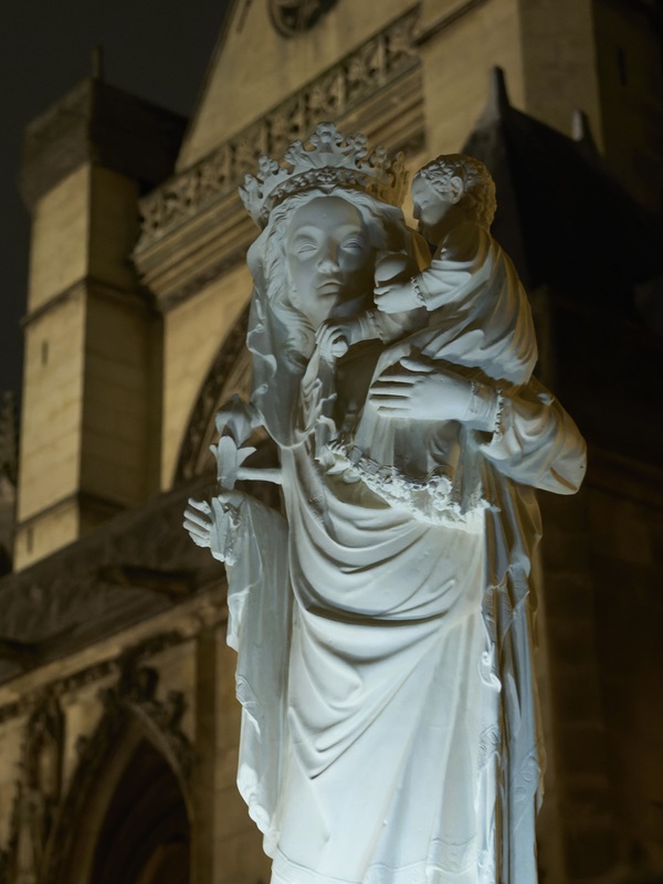 Вертикальная композиция: Скульптуры Марии интегрированы в линии фасадов, колонн и арок, подчеркивая устремлённость вверх.