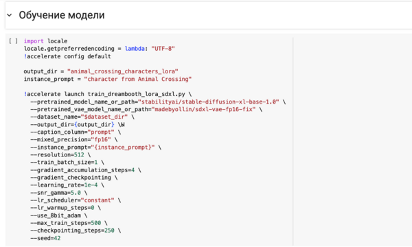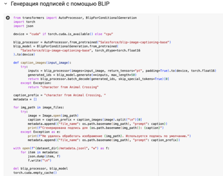 Перед этим загружается модель BLIP, которая делает подписи к картинкам. Если она не справляется, просто пишем, что на изображении персонаж из Animal Crossing. Все подписи потом выводятся, и в начале каждой добавляется фраза «в стиле», чтобы задать нужное настроение.