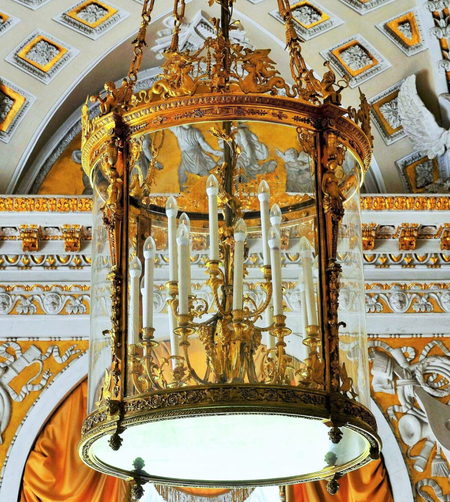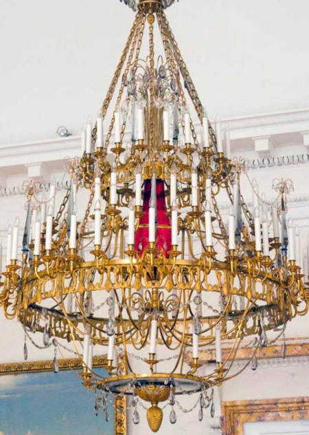 Люстры, созданные по проекту архитектора Дж. Кваренги, для Александровского дворца (конец 1790-х) — это массивные многоярусные конструкции с бронзовыми каркасами, украшенные позолотой и сотнями хрустальных подвесок, каждая до 100 свечей. Такие люстры имели сложную декоративную программу, включая цветное стекло (темно-красное и синее), что визуально усиливало роскошь и мощь интерьеров. Эти светильники создавали эффект избыточного блеска и подчёркивали высокий статус жителей дворца и их связь с имперской традицией.