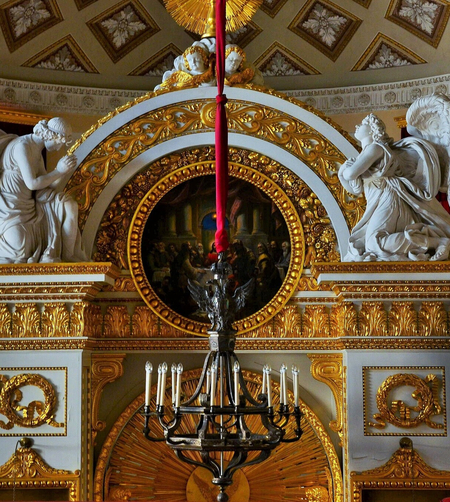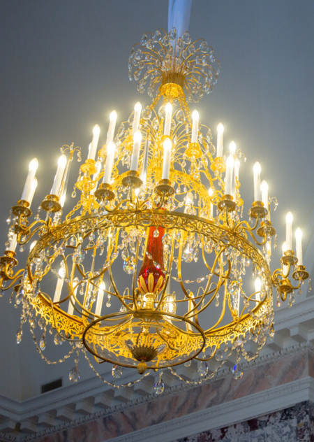 Прежде всего, статус подчеркивался через масштаб и многоярусность. В бальных залах европейских и русских дворцов, таком как Александровского, центральные люстры специально создавались заведомо больше, чем требовалось для освещения. Их многоярусные конструкции с десятками рожков, несколькими уровнями венцов и сложными подвесами формировали ощущение «избыточности», становясь архитектурными доминантами наравне с колоннами и плафонами.