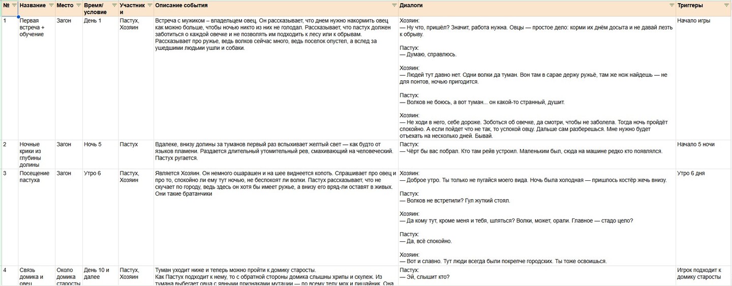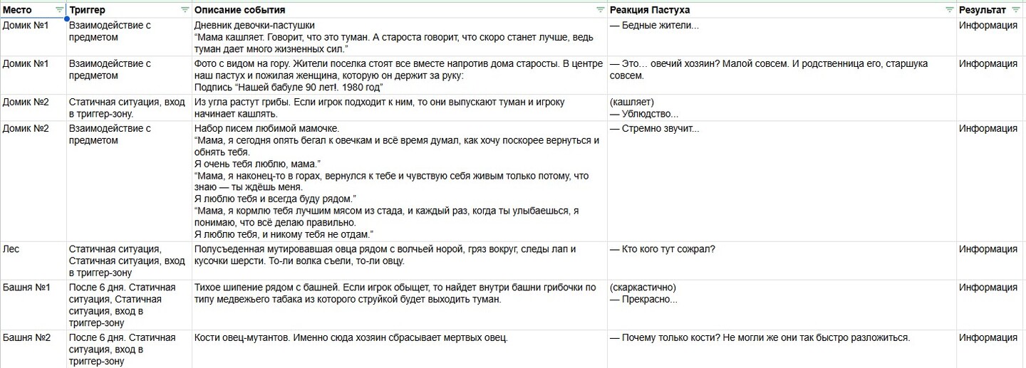 Выполняла функции нарративщика. Учавствовала в написании мотивации пастуха, его предыстории. Сформировала сюжетную таблицу с описанием обязательных и второстепенных событий-триггеров, которые помогут игроку изучить историю покинутого поселка в горах.