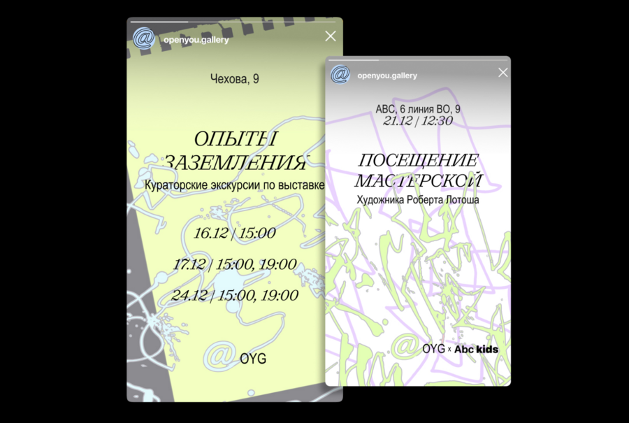 Рефлективный режим — для выставок, экскурсий и материалов о художниках (OPEN YOU). Линии накладываются на форму листа блокнота, что символизирует выход за рамки и широту творческого замысла.