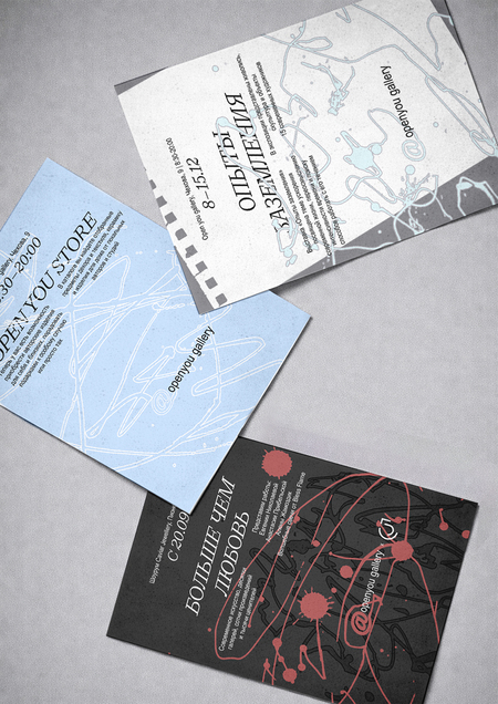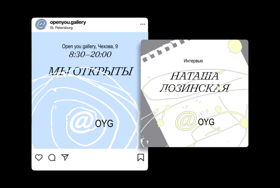 Айдентика для Open You Gallery — многофункционального арт-пространства, объединяющего галерею, стор и кофейню. В основе визуальной системы — символ @ как знак авторства и вовлечения, а также линии, отражающие процесс творчества и диалога с аудиторией.