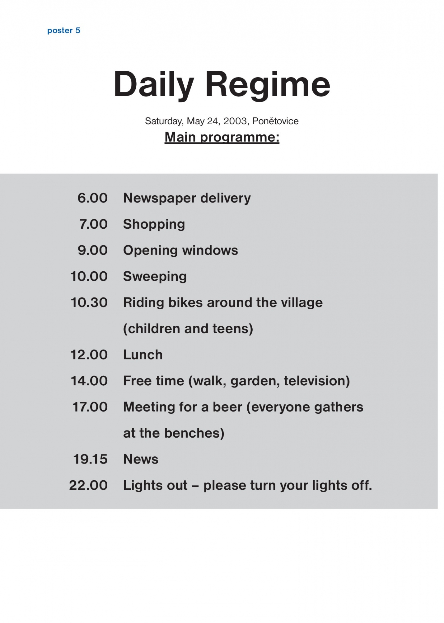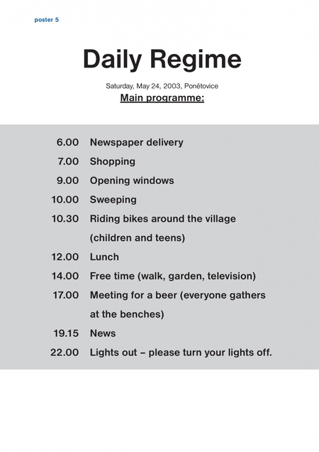 Самый большой публичный проект Катерины Шеда проходил в маленьком городке. Художница, изучив ритмы местного сообщества, предложила жителям стать участниками перформанса с чёткими правилами: вставать, посещать магазины, убирать улицы и ложиться спать в строго заданное время в течении одного дня. Этот жест превратил повседневность в хореографию действий, где каждый шаг подчинялся общему сценарию.