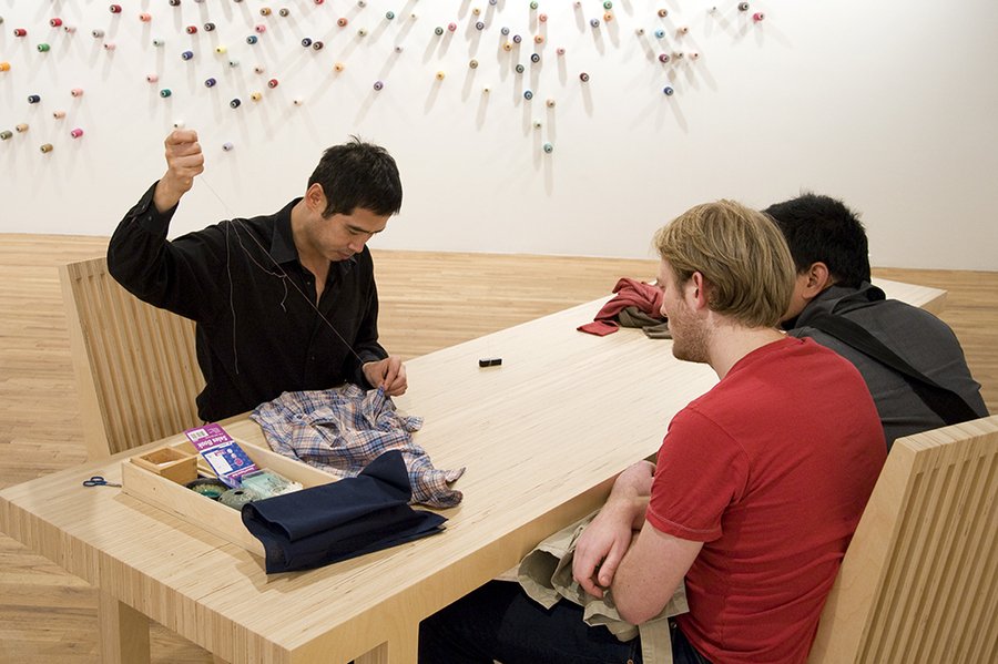Не менее интересным партиципаторным проектом-перфомансом является работа Ли Мингвея. В ней он перевоплощается и надевает на себя сразу несколько ролей, что перекликается с театрализацией жизни Н. Евреинова. Он становится и швеей, и собеседником, и при этом все еще остается художником и медиатором. Зрители здесь, на первый взгляд, остаются скорее пассивными наблюдателями, однако в данном проекте присутствуют интересующие нас связи с детской игрой: перечисленные выше игровые элементы (применение ролевых моделей), а также спонтанность — все зрители приносят разное — как и истории, так и вещи. Каждый предмет становится игровым элементом, который Ли Мингвей вплетает в общую ткань работы. Таким образом, художник трансформирует частные нарративы в коллективный опыт.