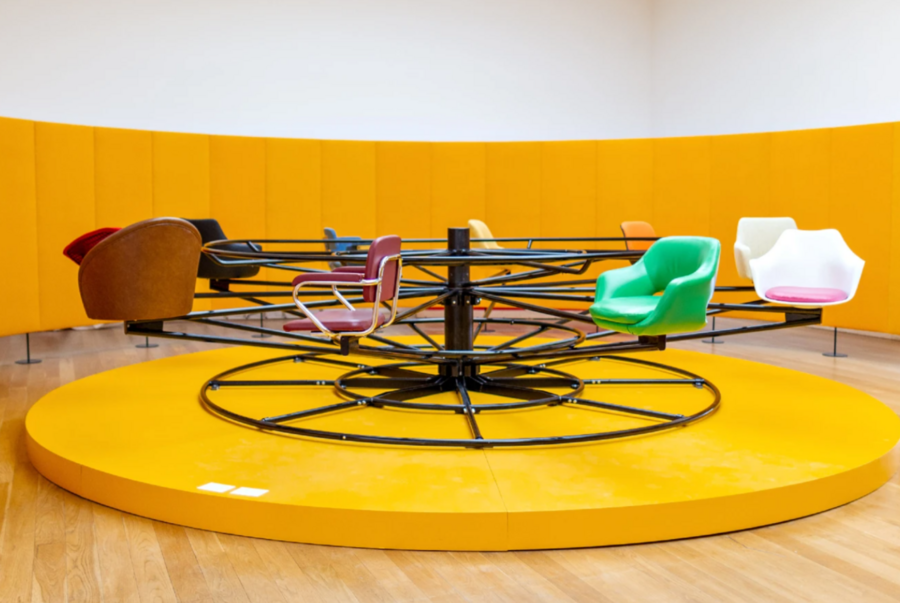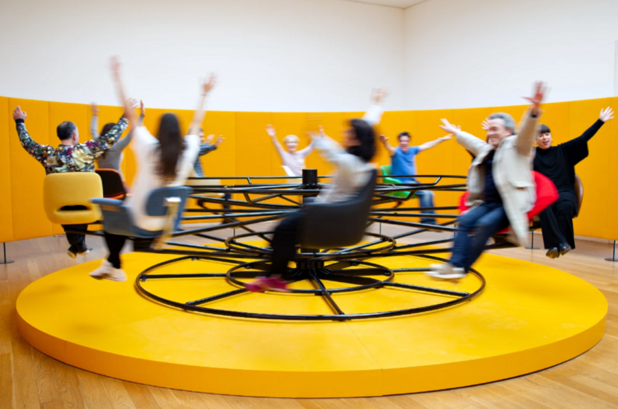 Работа Васконселос напрямую заигрывает с эстетикой детской игры, трансформируя её в социальный комментарий. Карусель, центральный объект инсталляции, становится местом взаимодействия: веселье, тактильный опыт и коммуникация, возникающие во время этой «игры», отсылают к базовым социальным навыкам, которые формируются в детстве. Если же рассматривать визуальный язык работы, то стоит отметить, что он контрастирует с детской наивностью: кресла карусели приняли офисный вид, а переплетения металлических конструкций черного цвета напоминают паутину социальных связей. Эта двойственность — столкновение беззаботности ребёнка и сложности взрослого мира — делает проект Васконселос визуальной притчей о природе человеческих отношений.