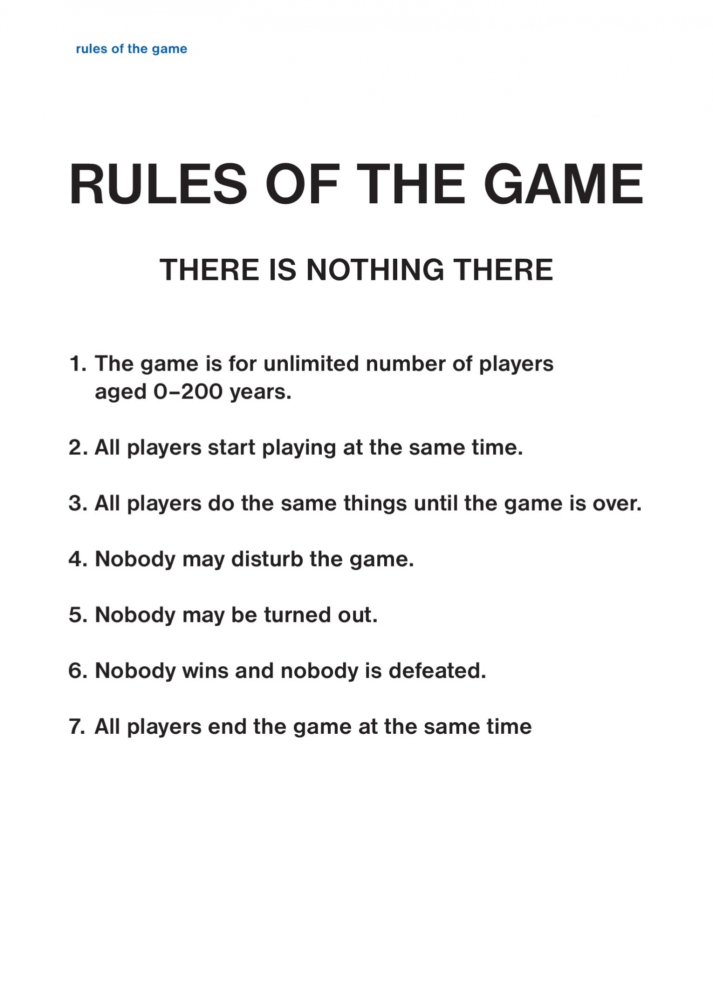 Пересмотр правил, осуществленный за счет смены ролей — художника на пассивного участника и зрителя на активного, создает ситуацию где изначальные условия (художник как объект) заданы, но результат зависит от коллективного выбора. Как и в детских играх, участники сталкиваются с дилеммой: следовать негласным нормам или нарушить их.