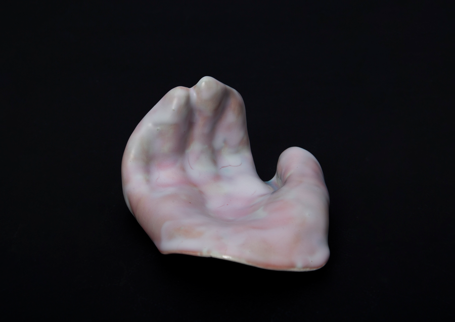 Отдельная работа в форме ладони фиксирует момент до жеста, состояние потенциального напряжения, ещё не перешедшего в сжатие. Она дополняет проект как противоположное состояние, как остановка и фиксация вместо активного давления.
