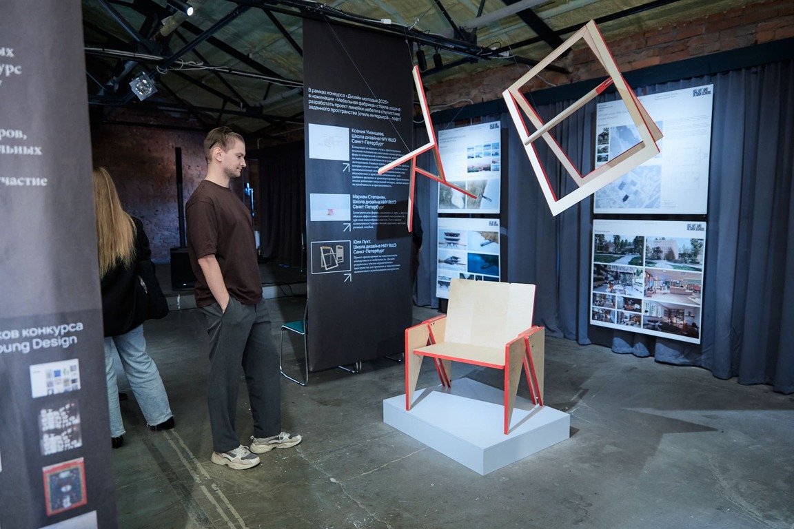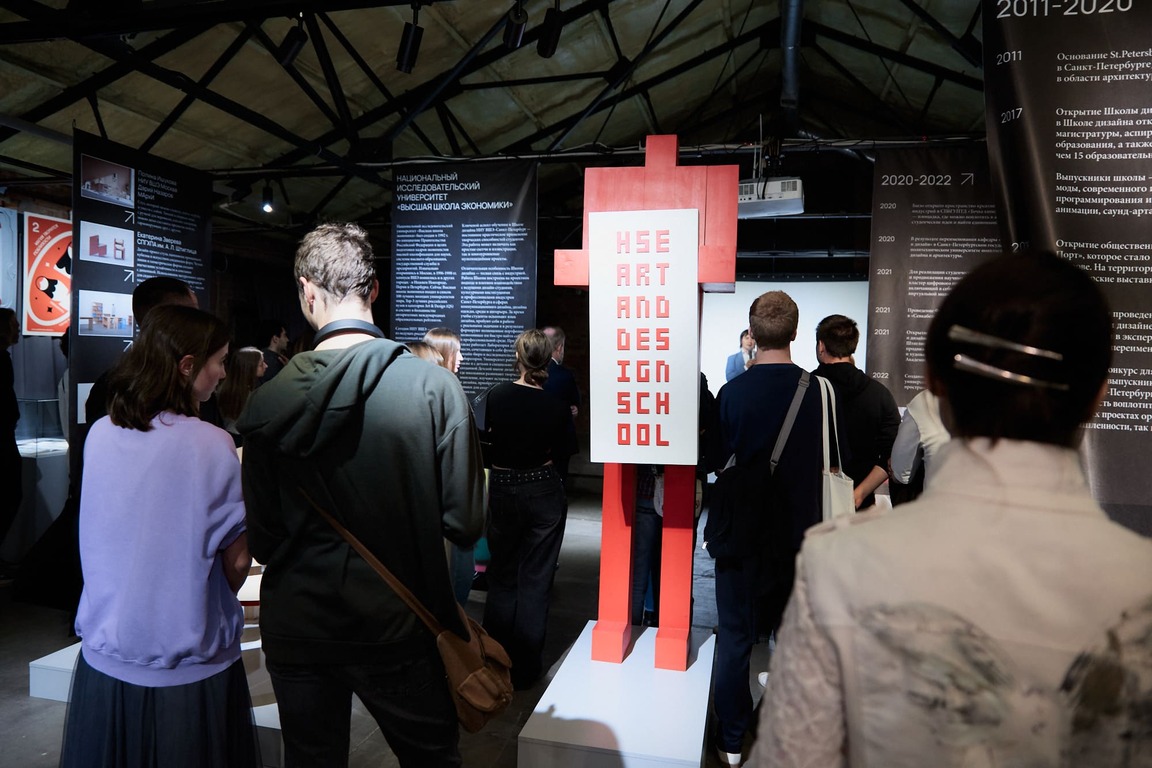 Экспозиция рассказывала об истории развития петербургского дизайна, фиксируя и особенности каждой школы, где Школа дизайна была представлена плакатами, книгами, видео и объектами в духе свободы самовыражения, развития индивидуального стиля и фокуса на современном дизайне и актуальных трендах.