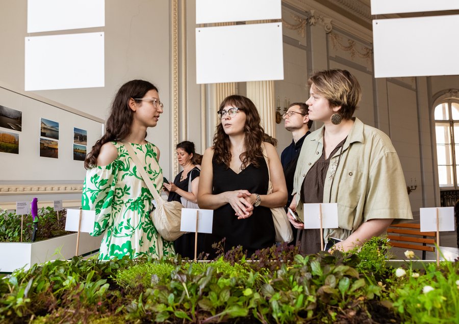 Основной задачей в оформлении выставки было создание «незаметного» дизайна, который не стал бы отвлекать от выставленных работ. В то же время нужно было грамотно зонировать пространство, чтобы представленные школы были обособлены, одновременно создавая общее пространство творческого духа, что было достигнуто введением черных тканевых полотен, разделяющих, но по сути невесомых.