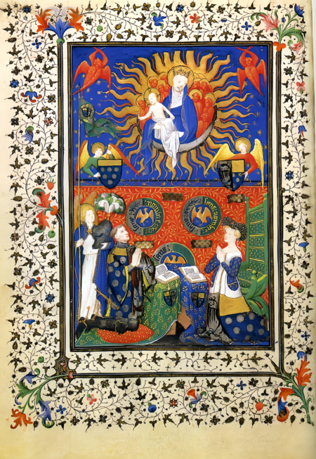 Часослов маршала Бусико. Маршал Бусико перед святой Екатериной (слева) Венчание (справа).1410-1415