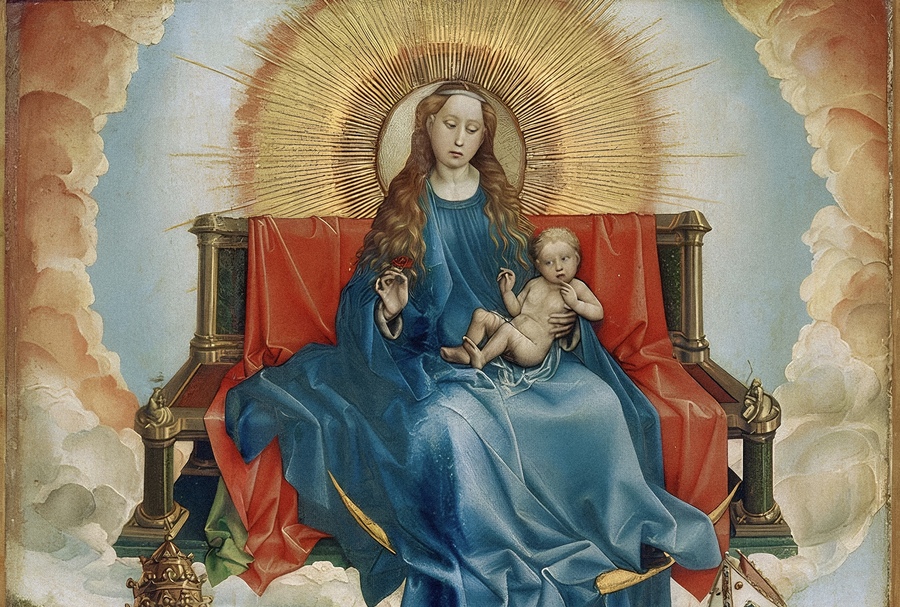 Ролан не уменьшен и не «отодвинут» — он по масштабу почти равен Деве, в тяжёлой шубе с богатыми узорами, с книгой и чётками на столе; его позу читают как демонстративное сочетание благочестия и самоуважения крупного чиновника. Марию коронует ангел, их трон вписан в тот же архитектурный объём, где сидит канцлер, так что божественное и земное оказываются в одном непрерывном пространстве.