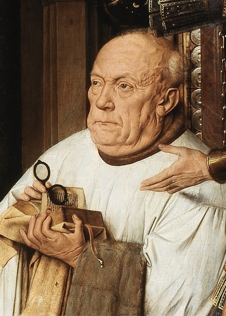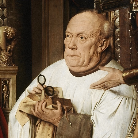 Ян ван Эйк — гений ранненидерландской живописи, один из первых начавший использовать масло вместо темперы. Ван Эйк стал известен благодаря материальному, пространственному изображению и реалистичным портретам. В «Гентском алтаре» художник создает иллюзию углублений в стенах алтаря, в которых молятся донатор и его жена. Необычным решением для своего времени стало изображение донаторов в три четверти, развернутыми к зрителю,