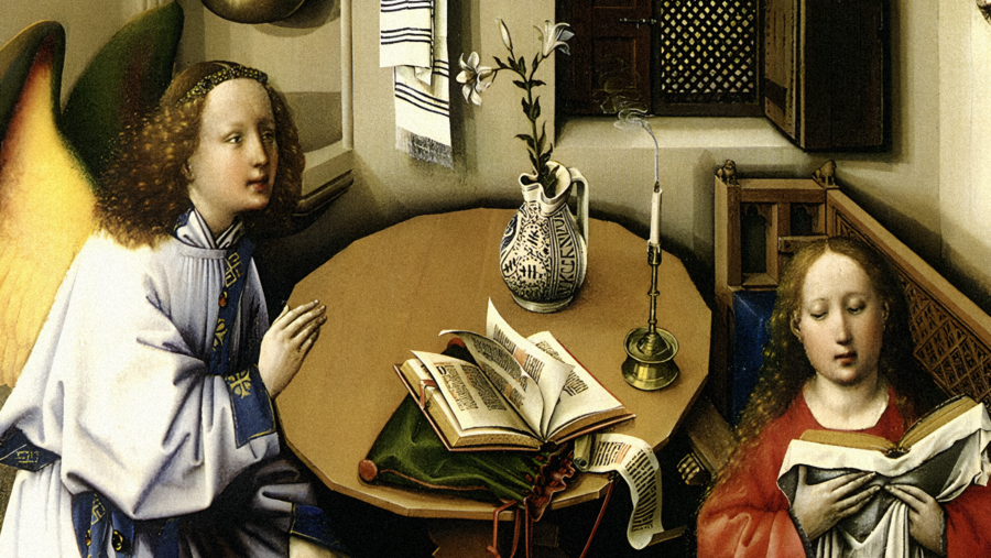 Дева Мария Робера Кампена теряет монументальность: художник распускает Мадонне волосы, дает в руки книгу и помещает в интерьер зажиточного горожанина