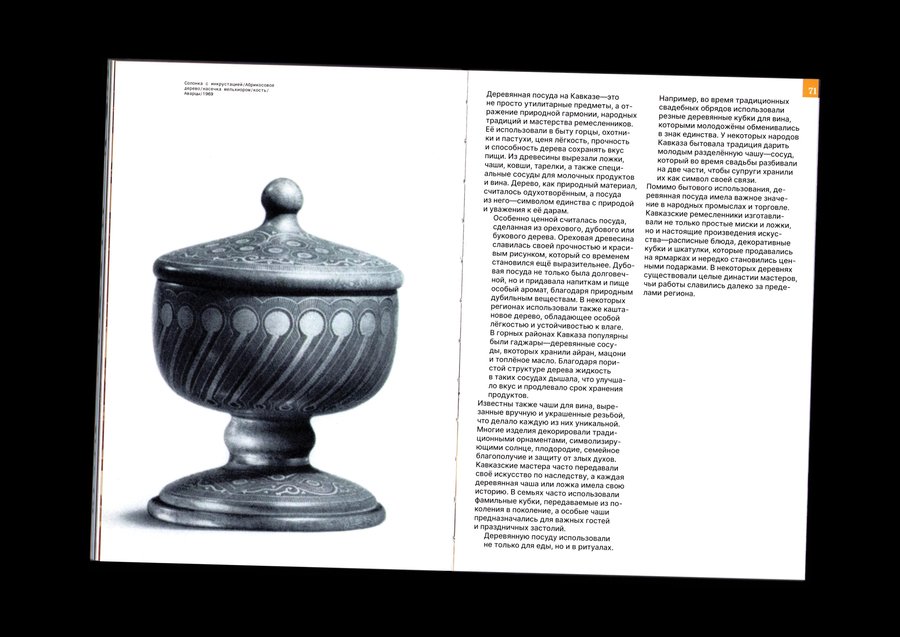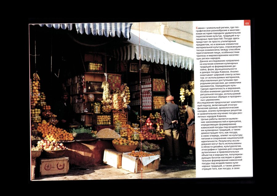 Визуальное исследование посвящено взаимосвязи между гастрономией и предметным дизайном. Оно рассматривает, как традиционные блюда, способы их приготовления и обряды трапезы повлияли на формообразование, декор и функциональность кавказской посуды.