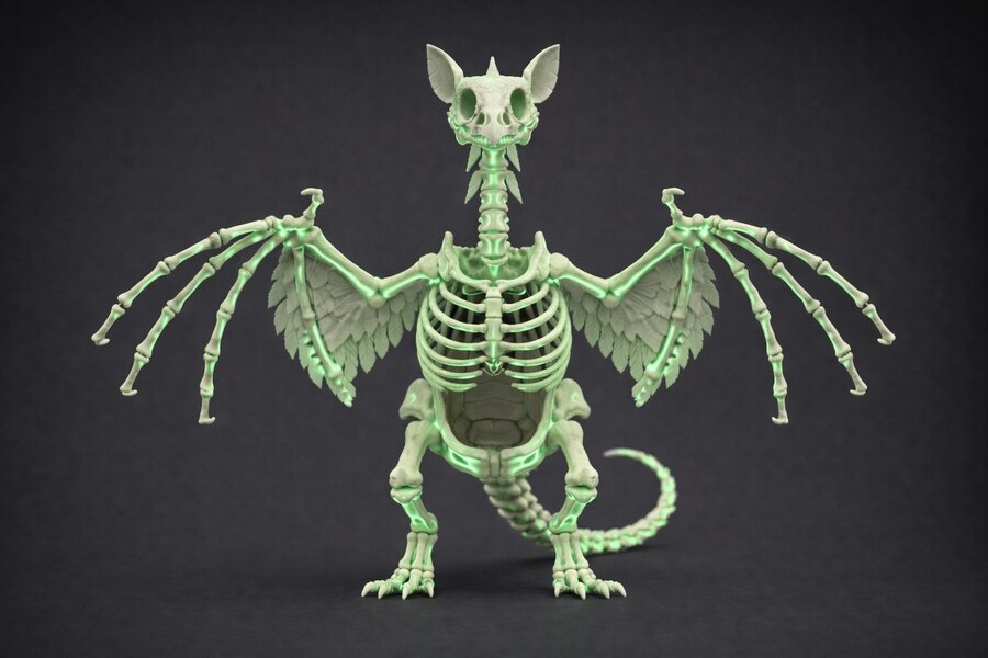 Контурный ночник: Зеленое неоновое свечение проходит сквозь ребра и вдоль хребта, создавая эффект «радиации» или магической энергии, исходящей изнутри существа.