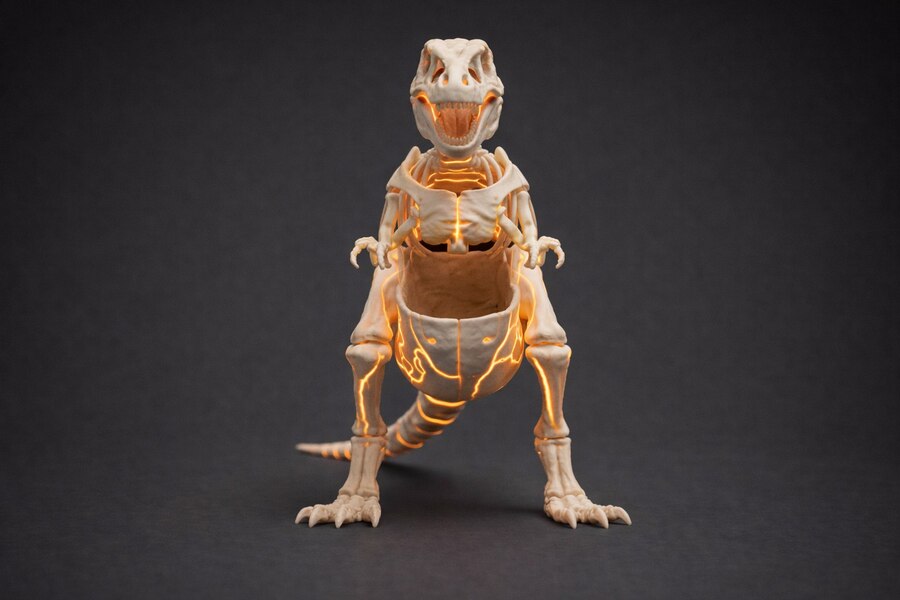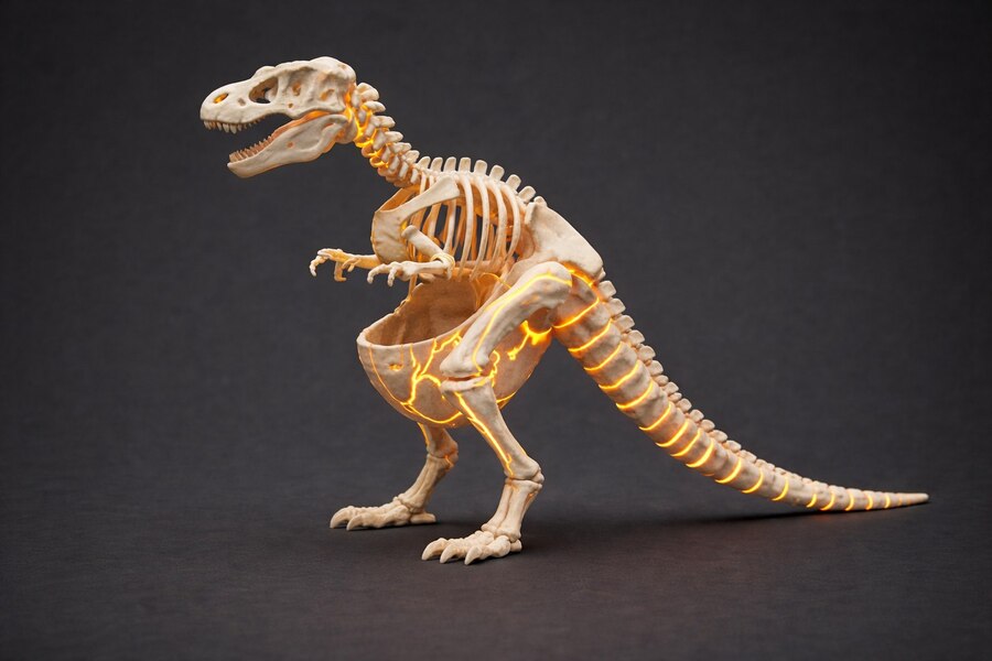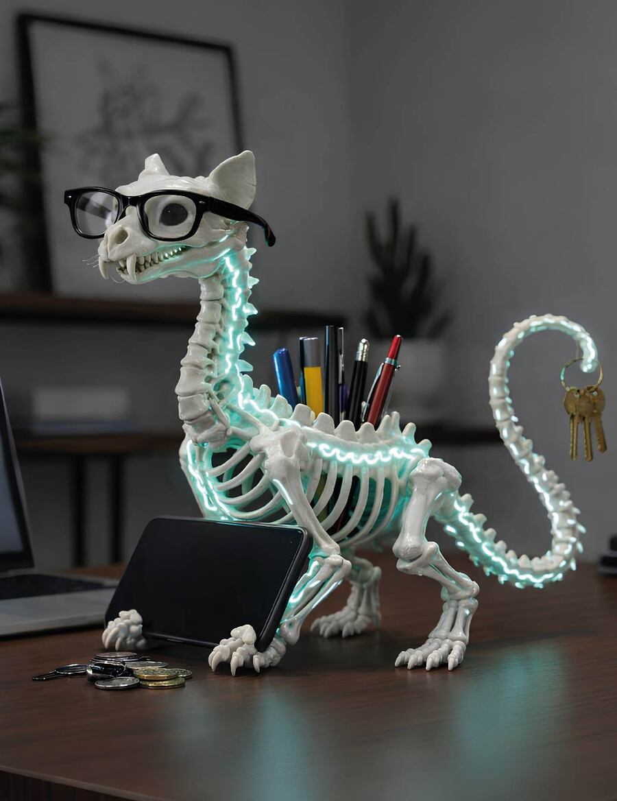 Каждая фигурка выполнена в стиле «неоновой палеонтологии», где костяная структура дополнена светящимися руническими линиями, которые превращают изделие в декоративный ночник.