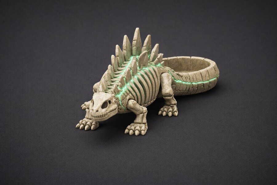 Вместо классических пластин стегозавра, его спина превращена в систему функциональных отсеков, а хвост завершается глубокой чашей, напоминающей панцирь, что делает его самым вместительным представителем коллекции.