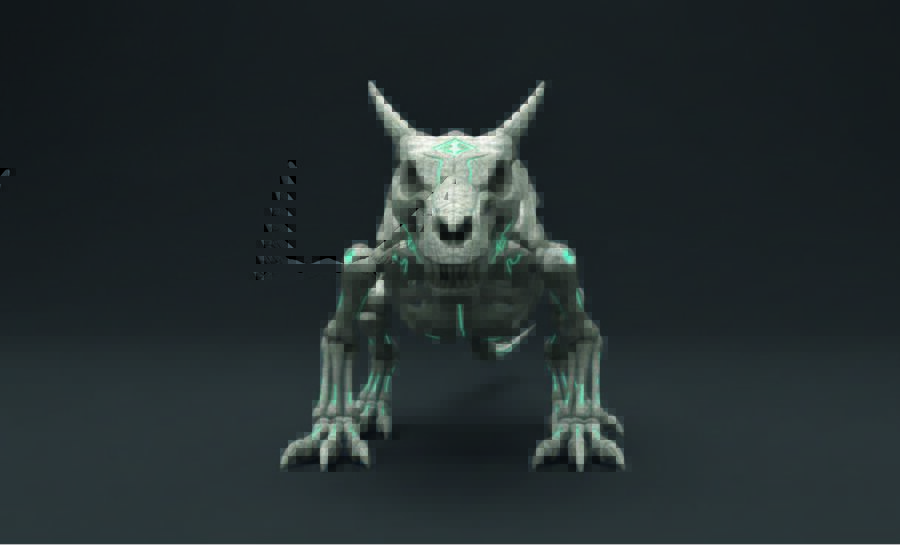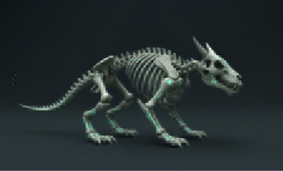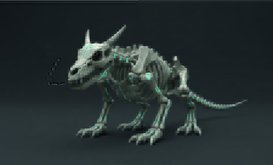 От трицератопса — массивные рога и мощную структуру грудной клетки. Это существо выглядит так, будто оно пришло из неоновых джунглей далекого будущего.