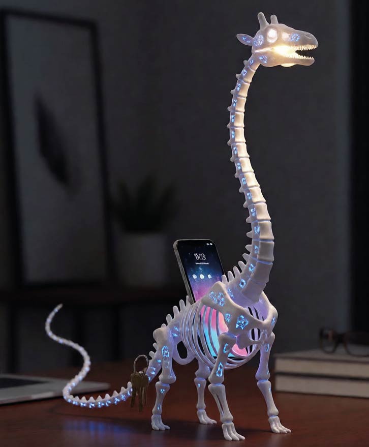 Направленная лампа: Длинная шея служит идеальным кронштейном для встроенного освещения. Голова-череп выступает в роли плафона, направляя мягкий свет на рабочую зону стола.