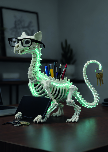 Световой акцент: Зеленое неоновое свечение, имитирующее магические руны на костях, позволяет использовать фигурку как ночной ориентир на рабочем месте.