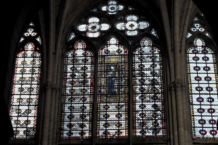 Внутри собора, при ярком солнечном свете, свинцовые линии становятся черными, создавая эффект четкого, но не отвлекающего рисунка. Это системное решение превратило витраж в своего рода раннюю пиксельную графику, где каждый кусочек стекла — это цветной пиксель, а свинцовый контур — его граница.
