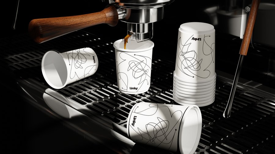 Промт: «Design for a coffee cup featuring the same minimalist beige and brown style as the LINKY coffee shop branding. The design should include flowing lines and simple shapes, possibly integrating elements of connection such as lines or connected shapes, to make it warm, cozy, and suitable for a coffee shop specializing in dating and connection.»