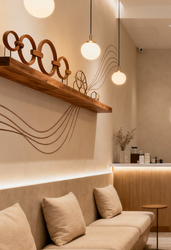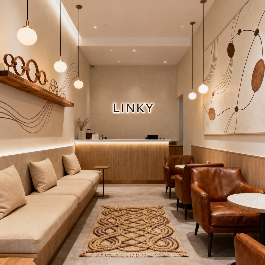 Промт 3: «Stylish interior design of a coffee shop LINKY with minimalist beige and brown branding. The space features cozy seating, warm lighting, and decorative elements that emphasize connection, using flowing lines and connected shapes in the decor and wall art. The atmosphere is inviting and modern, suitable for dating and meetings.»