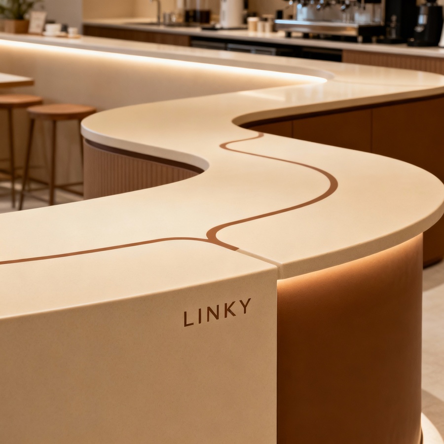 Промт 2: «Close-up view of a minimalist beige and brown style coffee shop counter for LINKY. The counter design features flowing lines and simple shapes with connection elements, incorporating warmth and elegance. The style is modern and cozy, fitting a coffee shop specialized in dating and connection, with clean surfaces and ambient lighting.»