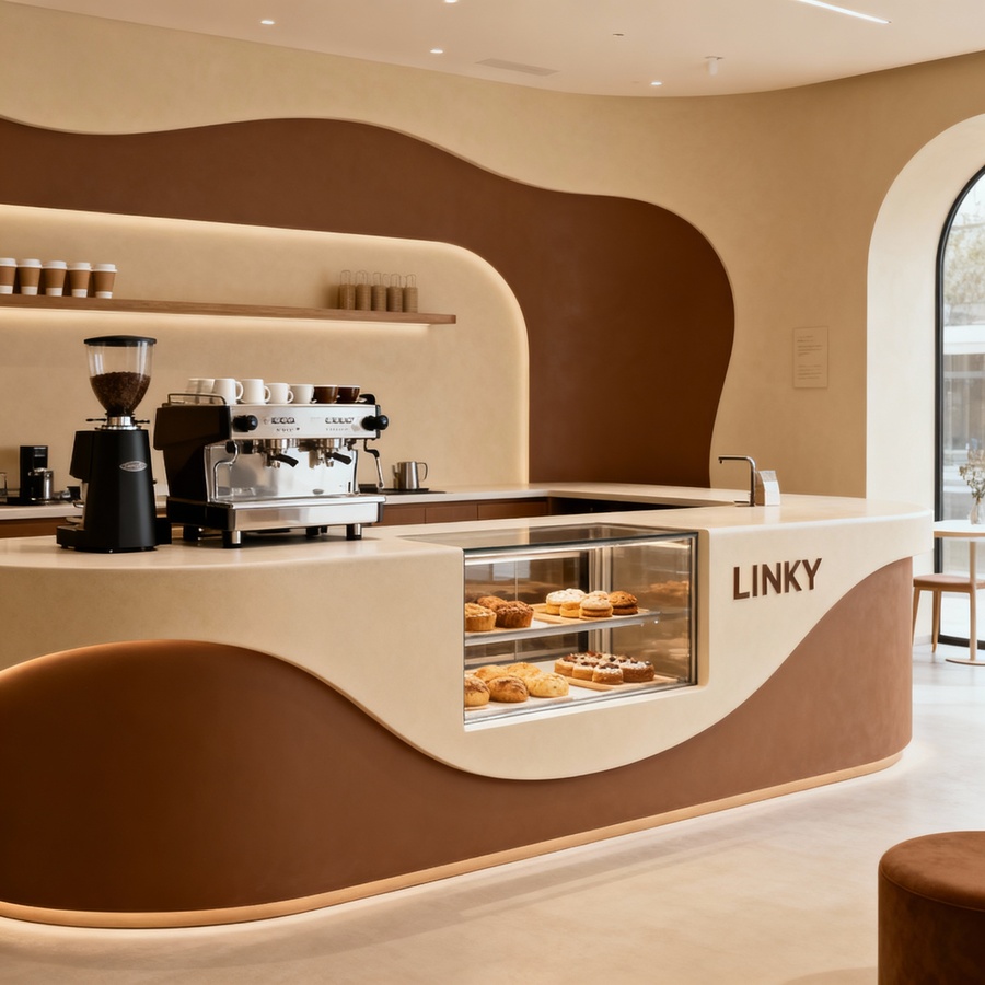 Промт 1: «Minimalist coffee shop counter for LINKY in beige and brown style. The counter includes a coffee machine and coffee cups on the surface, but the pastry display case is integrated into the counter front, visible at counter level. The design uses flowing lines, simple shapes, and warm, cozy tones, emphasizing connection and elegance. Modern, friendly coffee shop atmosphere.»