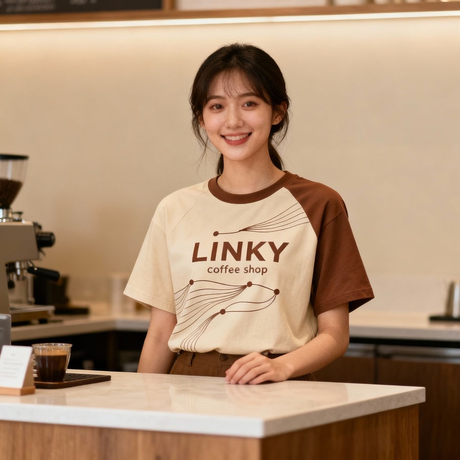 Промт 1: «Close-up portrait of a young woman standing behind a coffee shop counter wearing a T-shirt with minimalist beige and brown LINKY coffee shop design. The T-shirt features flowing lines and connection elements consistent with the coffee shop branding. The woman is friendly and inviting, with warm lighting and a cozy atmosphere. The style is modern and stylish.»