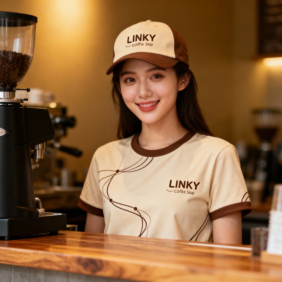Промт 2: «Close-up portrait of a young woman standing behind a coffee shop counter, wearing a T-shirt and a cap with minimalist beige and brown LINKY coffee shop design. Both T-shirt and cap feature flowing lines and connection elements consistent with the coffee shop branding. The woman looks friendly and inviting, in warm lighting with a cozy atmosphere, modern and stylish style.»