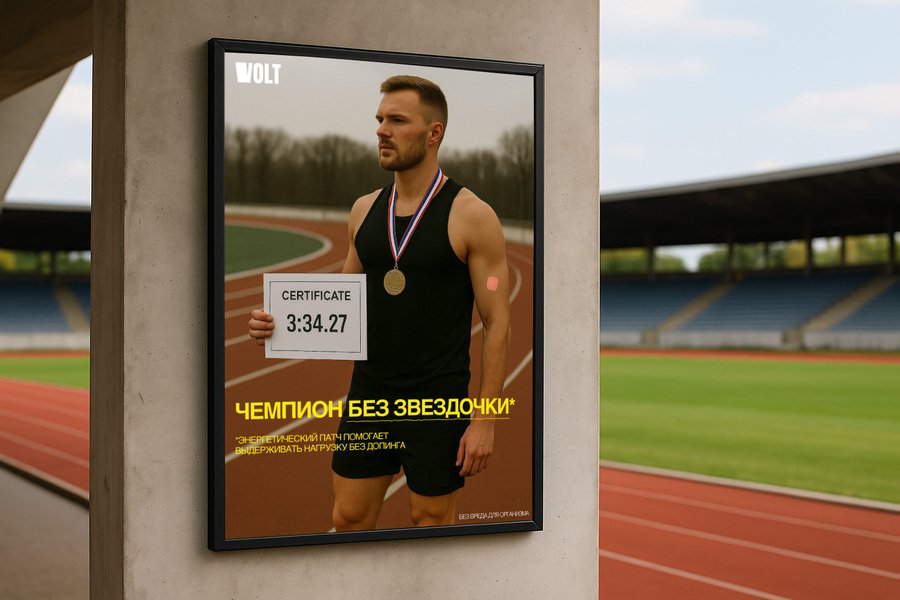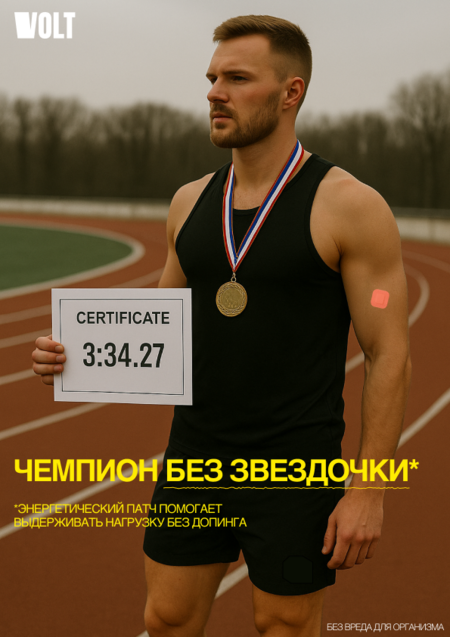 В рамках рекламной кампании энергопатчей «VOLT» наиболее эффективным инструментом стала метафора «чемпиона без звёздочки» — честной победы без допинга. Связка визуальных образов спортсменов, использующих патч и одновременно участвующих в соревнованиях, позволила закрепить ассоциацию между VOLT и легальной, безопасной поддержкой при нагрузках. Такая подача не только формирует доверие к продукту как к альтернативе агрессивным стимуляторам, но и подчёркивает его необходимость в жизни тех, кто хочет достигать высоких результатов, не рискуя при этом здоровьем и карьерой.
