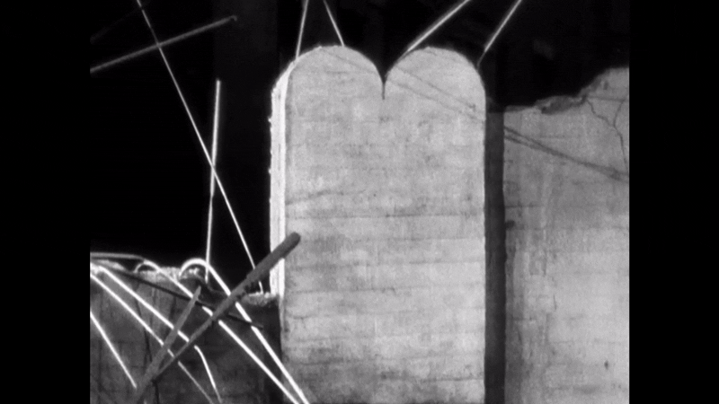 Каждое появление скрижалей сопровождается световым акцентом, который подчеркивает их сакральный статус. Помимо истории создания десятисловия из первой части, Сесил ДеМилль целенаправленно вводит визуальные символы скрижалей в современный мир, делая их лейтмотивом на протяжении всего фильма. Визуальные мотивы скрижалей в современной части фильма создают эффект «вечного закона».