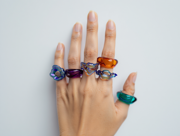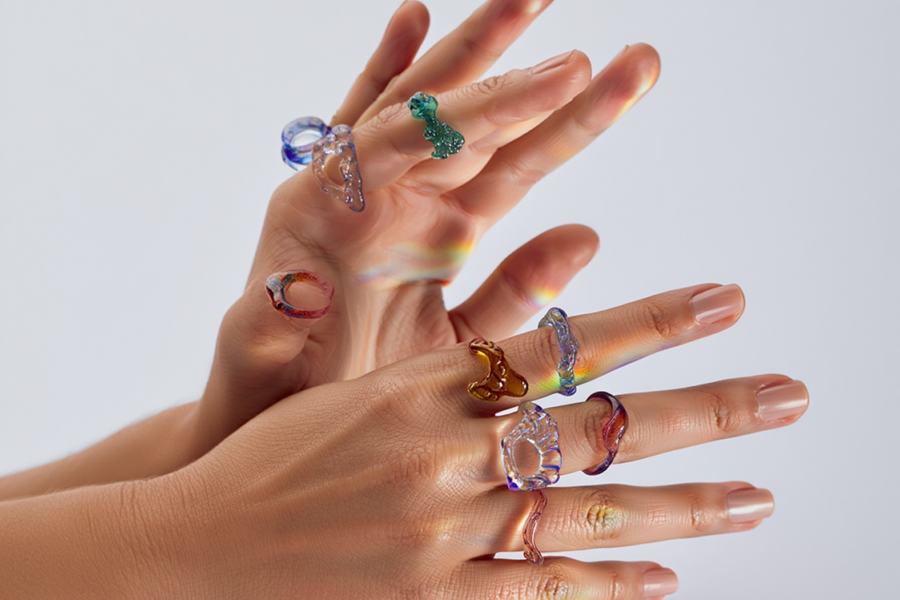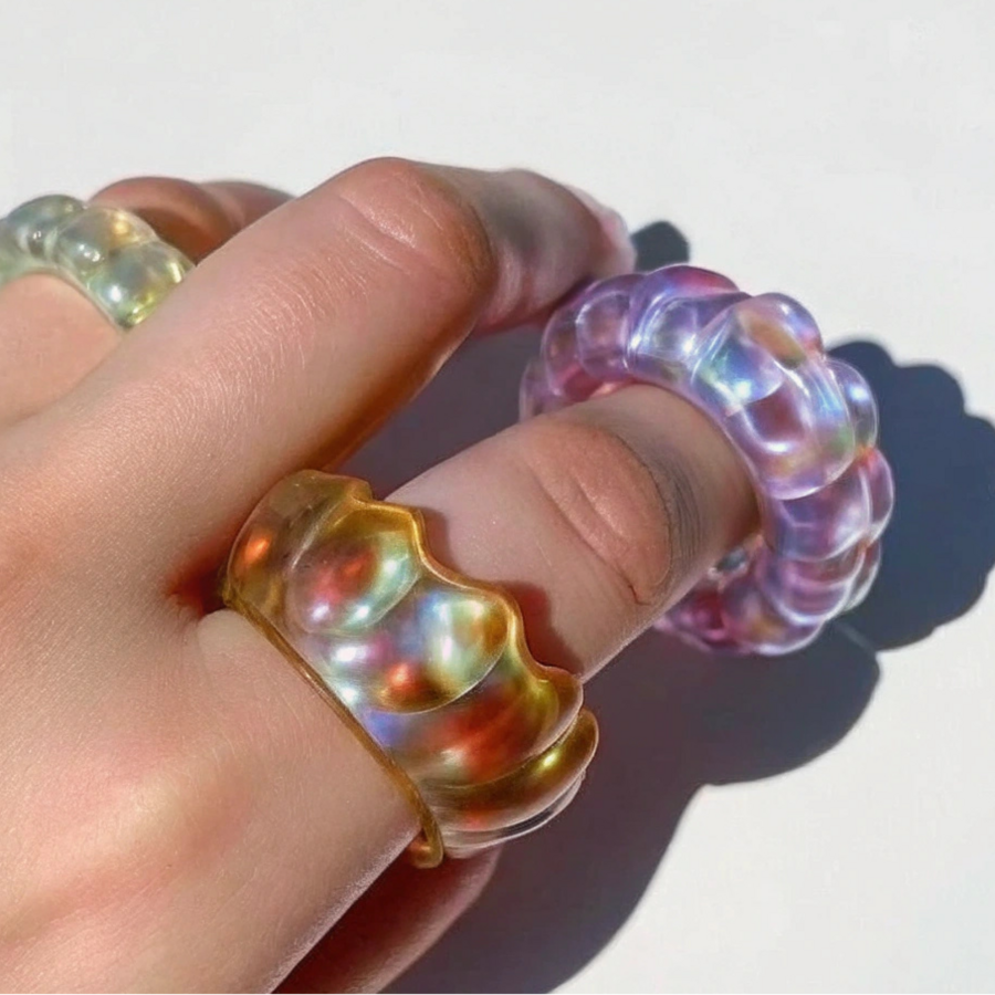 Reve and Recraft/Promt: rings, textured, bright rings, colored transparent glass, curvilinear, like melted glass, abstract shapes connected into one ring, all the rings are multicolored, the color spectra are bright, borosilicate transparent glass, the rings are on a white background, a subject photo, the rings are illuminated with contrasting light, the light is refracted through the glass